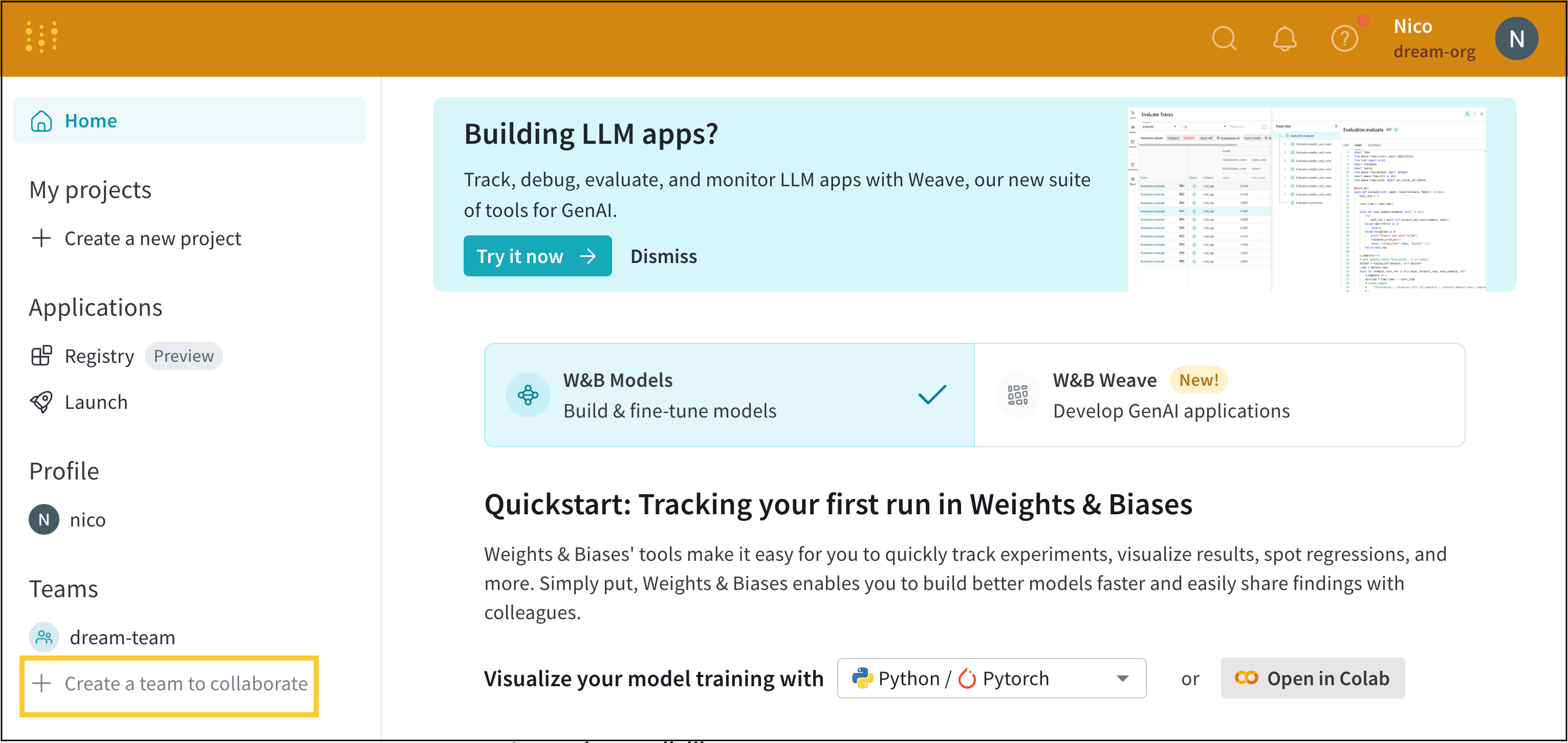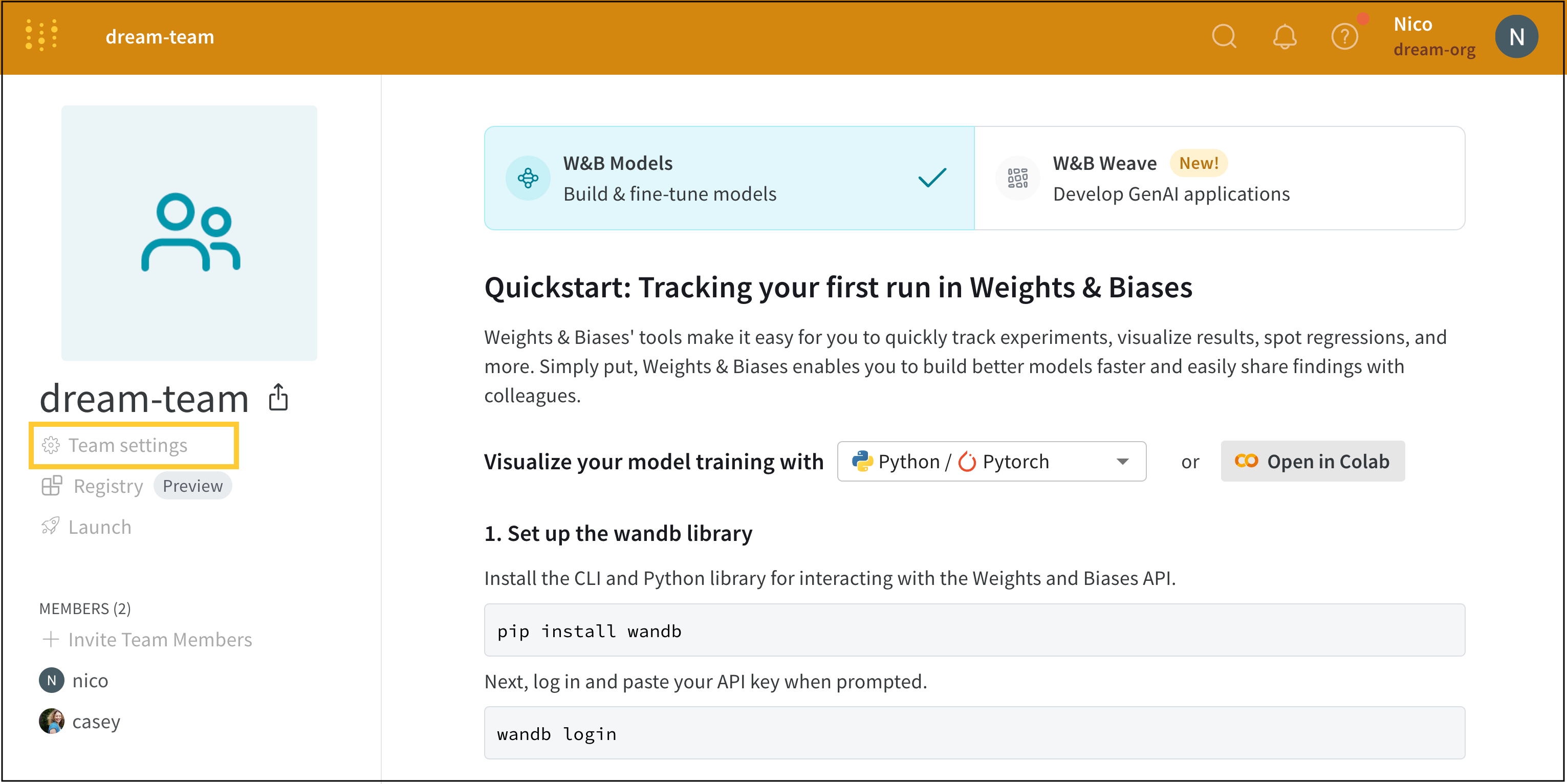 1. https://wandb.ai/<team-name>로 이동합니다.
