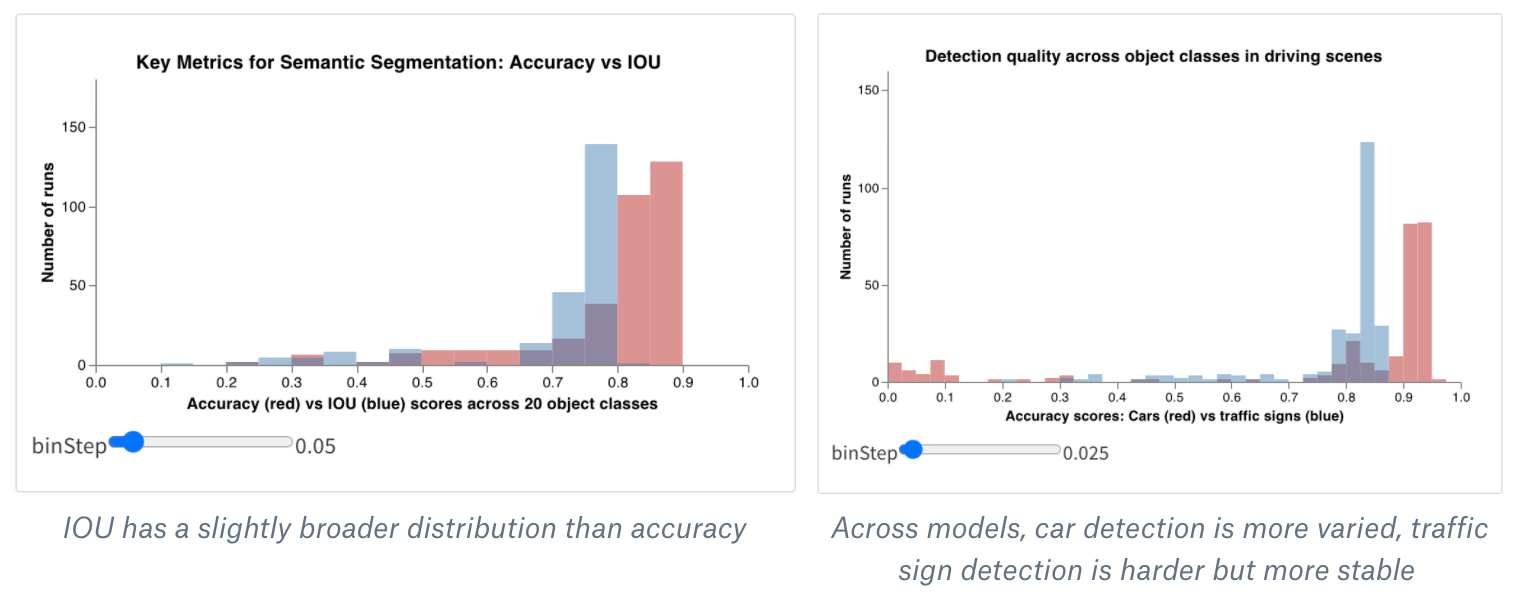 ヒストグラムは、数値の分布を可視化し、大きなデータセットを理解するのに役立ちます。コンポジットヒストグラムは、同じビンにまたがる複数の分布を示し、異なるモデルまたはモデル内の異なるクラス間で2つ以上のメトリクスを比較することができます。ドライブシーンのオブジェクトを検出するセマンティックセグメンテーションモデルの場合、精度最適化と Intersection over union (IOU) の効果を比較したり、異なるモデルが車(データの大きく一般的な領域)と交通標識(より小さく一般的でない領域)をどれだけよく検出するかを知りたいかもしれません。デモ Colab では、生命体の10クラスのうち2つのクラスの信頼スコアを比較できます。