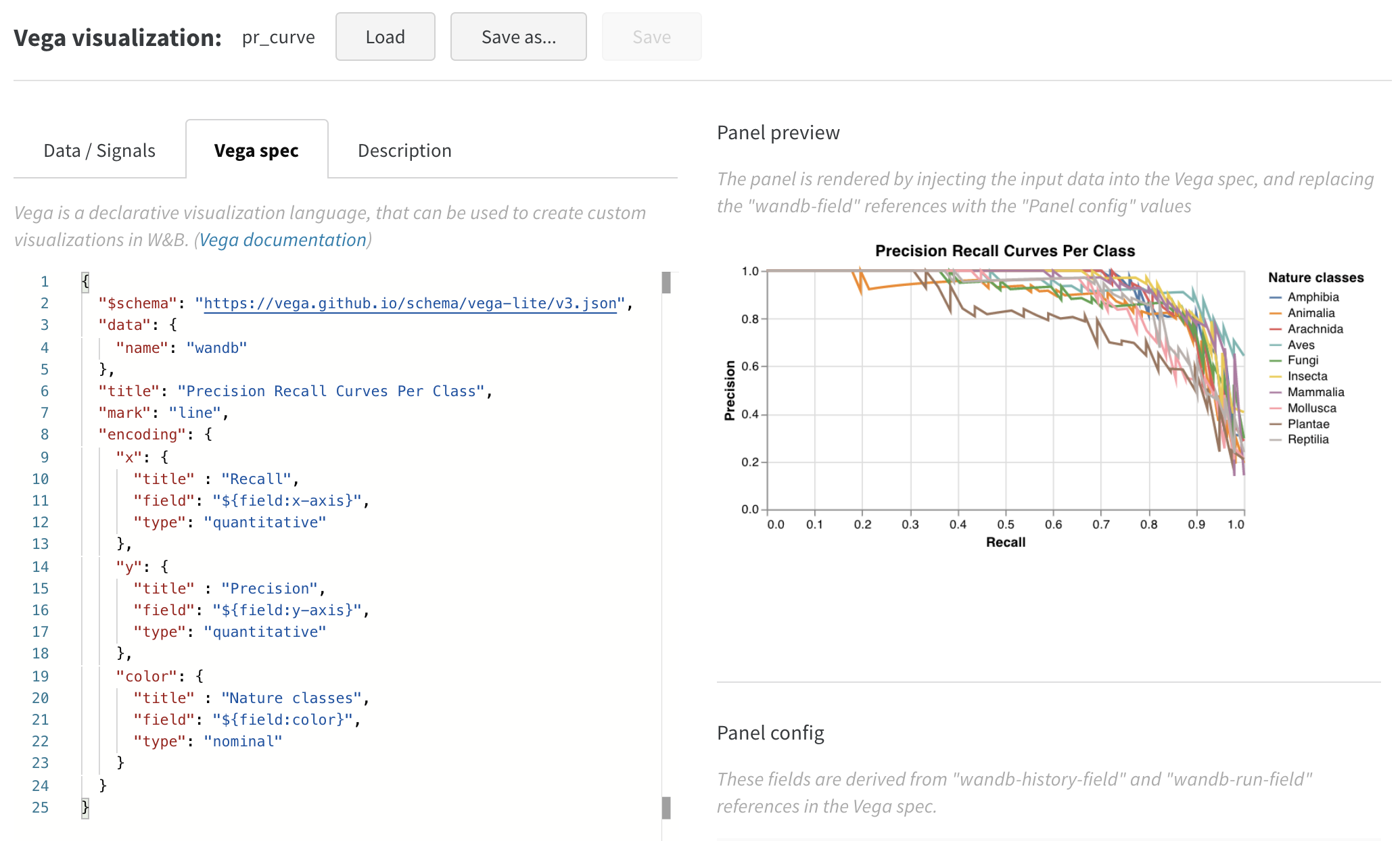 の植物の予測スコアを選びました。 - プレビュー表示に表示されるプロットに満足するまで、Vega スペックとクエリを変更し続けることができます。完了したら、上部で Save as をクリックしてカスタムプロットに名前を付けて再利用できるようにします。 次に Apply from panel library をクリックしてプロットを終了します。