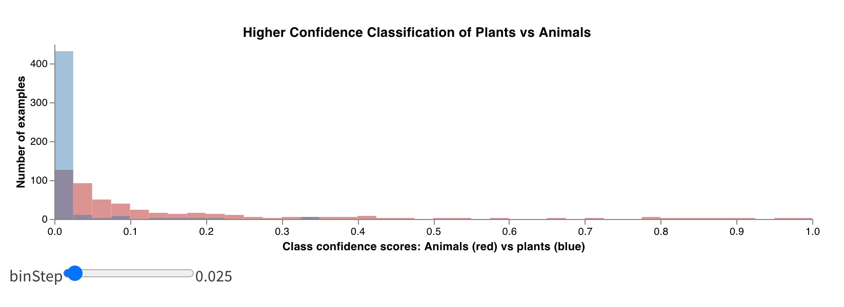 私の非常に短い実験の結果は次のようになりました:1,000エポックで1,000エグゼンプルだけでトレーニングすると、モデルはほとんどの画像が植物でないことに非常に自信を持ち、どの画像が動物かについては非常に不確かです。