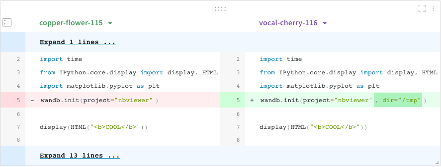 서로 다른 W&B Runs에서 사용된 코드를 비교합니다.