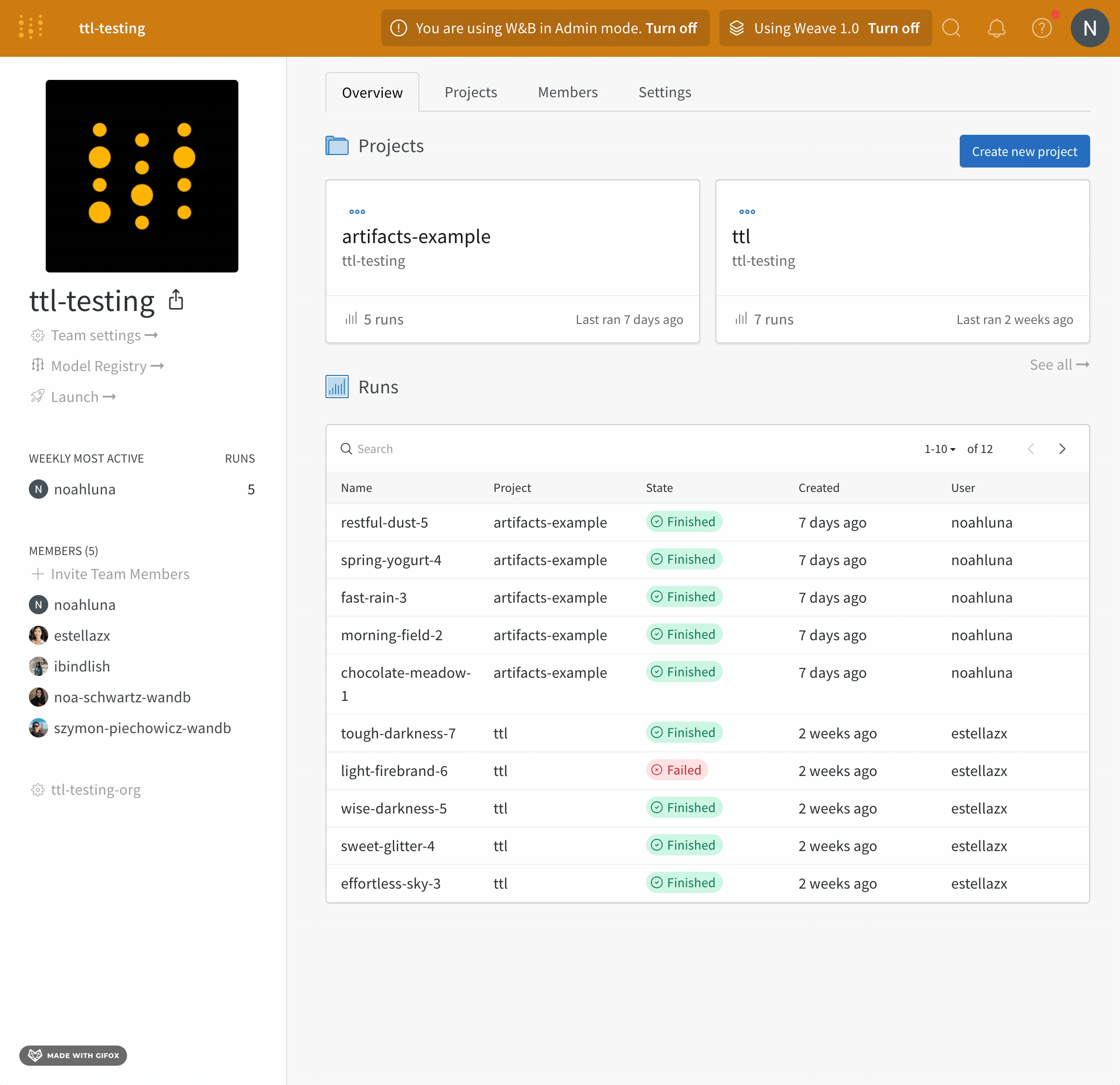 - W&B 앱 UI에서 아티팩트 세부 정보에 TTL 정책을 설정하거나 편집하는 옵션이 표시되지 않거나 프로그래밍 방식으로 TTL을 설정해도 아티팩트의 TTL 속성이 성공적으로 변경되지 않으면 팀 관리자가 해당 권한을 부여하지 않은 것입니다.