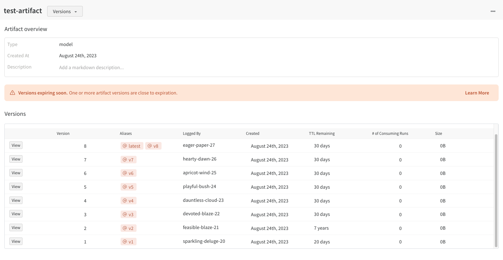 Python SDK 또는 W&B App UI를 사용하여 아티팩트에 대한 TTL 정책을 봅니다.