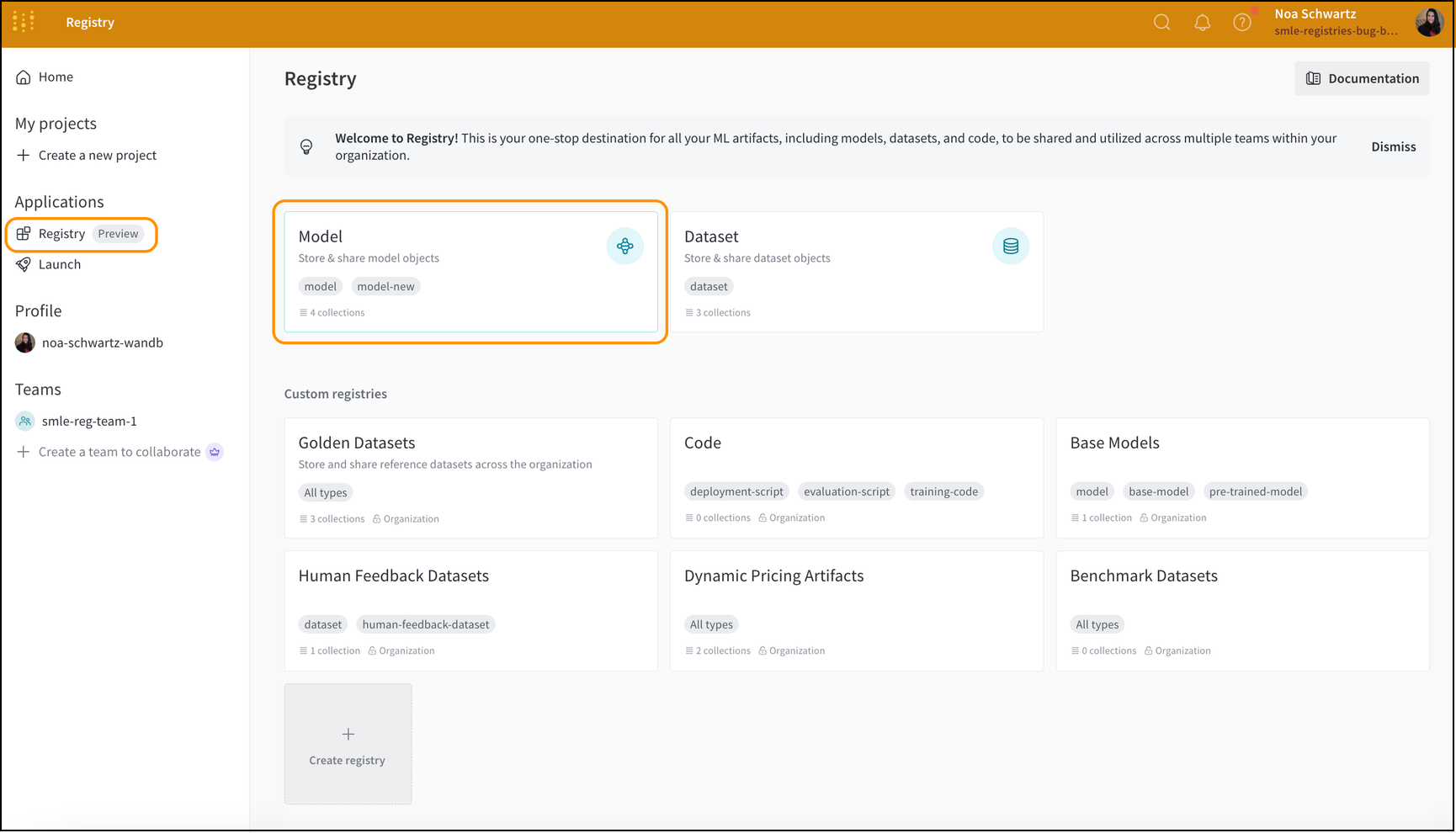 기존 Model Registry와 달리 W&B Registry는 Models 또는 데이터셋 레지스트리에만 국한되지 않습니다. 특정 워크플로우 또는 프로젝트 요구 사항에 맞게 조정된 사용자 정의 레지스트리를 만들어 임의의 오브젝트 유형을 담을 수 있습니다. 이러한 유연성을 통해 팀은 고유한 요구 사항에 따라 Artifacts를 구성하고 관리할 수 있습니다. 사용자 정의 레지스트리를 만드는 방법에 대한 자세한 내용은 사용자 정의 레지스트리 만들기를 참조하십시오.