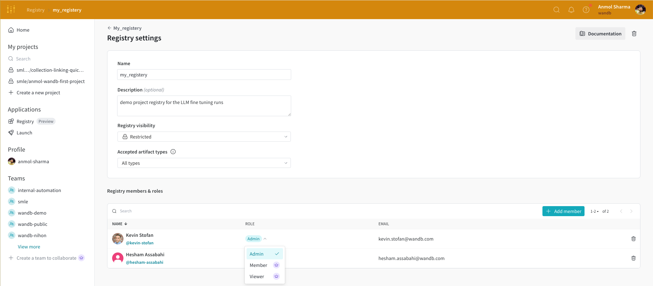 마이그레이션 후 모델 레지스트리는 조직 수준의 가시성을 갖습니다. 역할 할당을 통해 레지스트리에 액세스할 수 있는 사용자를 제한할 수 있습니다. 이를 통해 특정 멤버만 특정 레지스트리에 액세스할 수 있습니다.