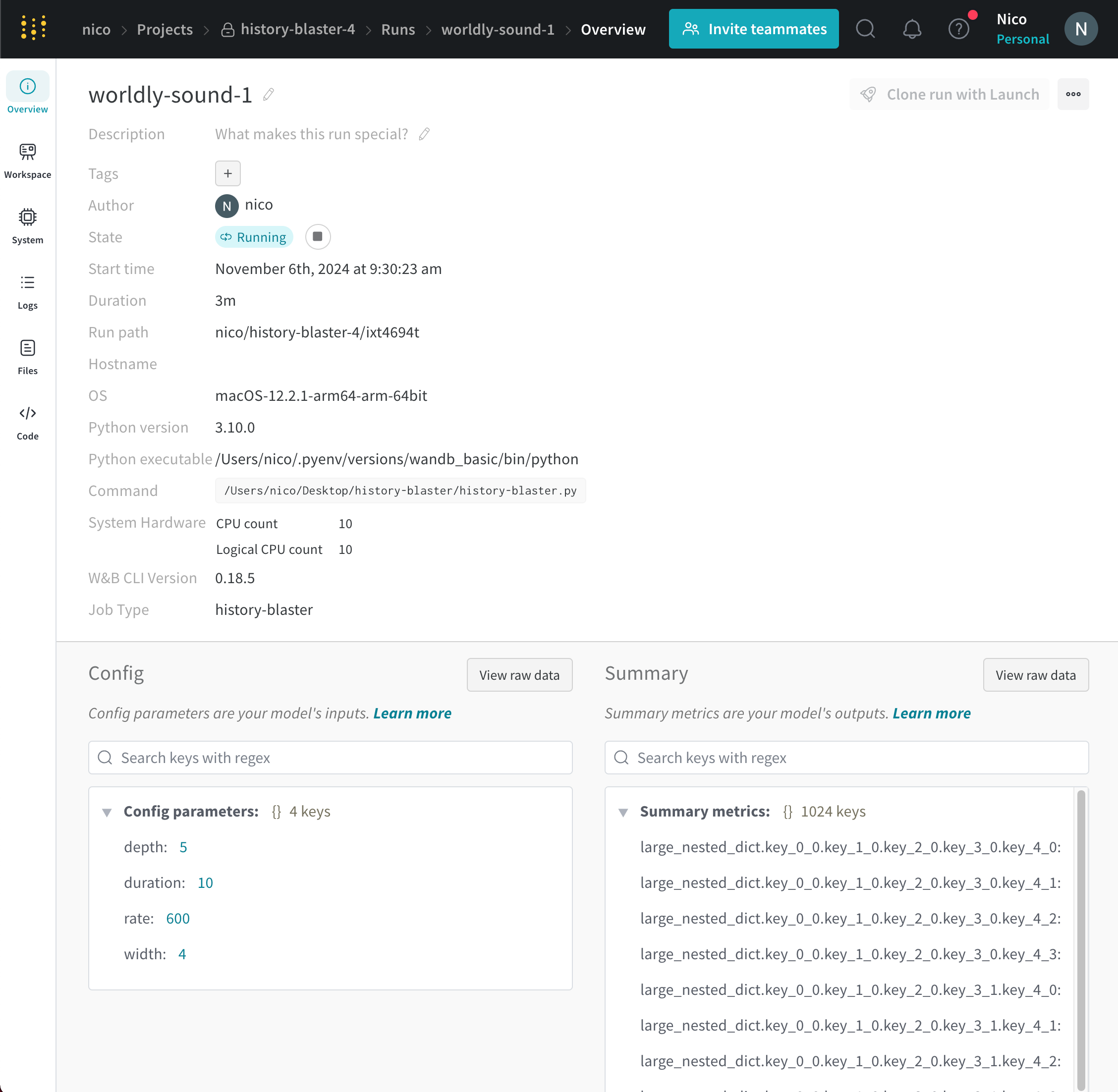 이전 코드는 id 파라미터에 대한 인수를 지정하지 않았으므로 W&B는 고유한 run ID를 만듭니다. 여기서 nico